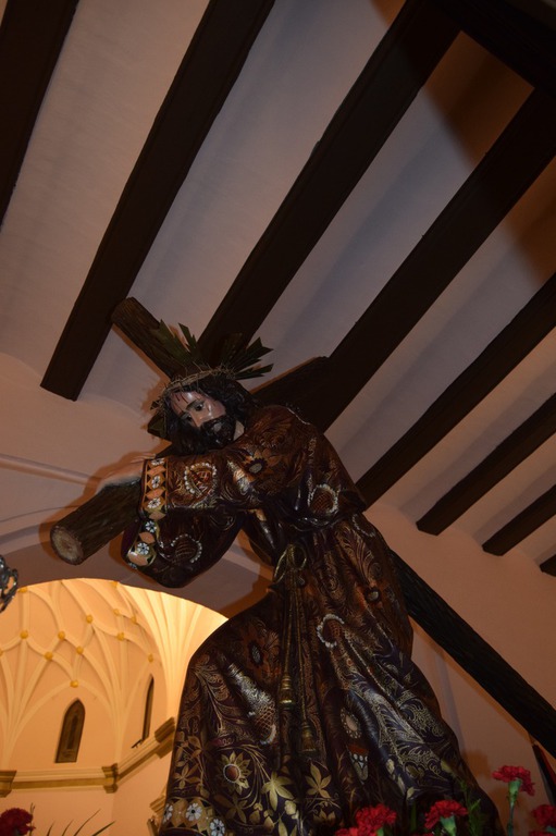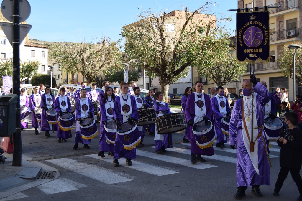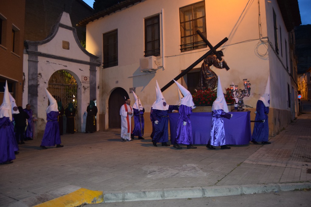 Salgamos a la calle hombro con hombro, dispuestos a compartir el peso de los problemas con el hombre y la mujer que no encuentran trabajo, con las personas que sufren maltrato, con la pareja que no puede mantener a su familia, con el amigo que ha tenido una mala noticia…; como vemos al Nazareno cargando con su Cruz al cruzarnos con Él por la Avenida del Pilar, un Martes Santo o puede que un Miércoles Santo, apoyado sobre hombros de color púrpura y blanco de los cofrades de “Nuestro Padre Jesús Nazareno”, acompañado por la Madre Dolorosa junto a la Cofradía de la “Sangre de Cristo y de la Buena Muerte”.