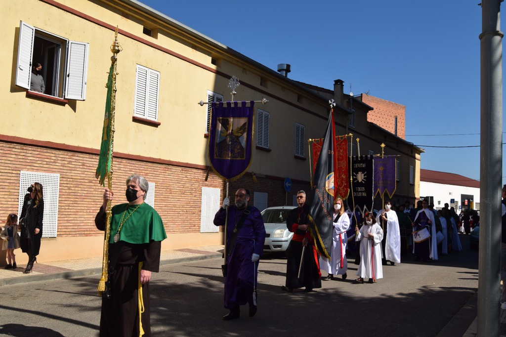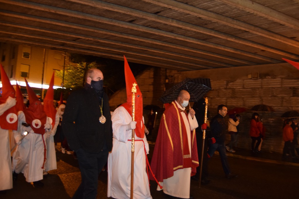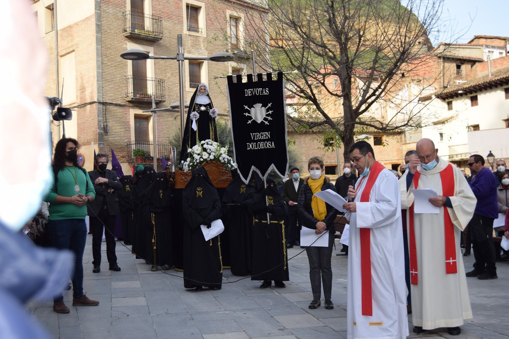Salgamos a la calle para encontrarnos con los que caminan por ella junto a nosotros cada día, con nuestros vecinos, con nuestros amigos, también con aquellos a los que no conocemos; como se encuentran la Madre Dolorosa y el Hijo azotado, condenado, insultado…, como se encuentran Jesús y María, con una mirada de amor, frente a frente, como se acercan uno al otro cada Viernes de Dolor en la Plaza Mayor donde se encuentran las cofradías, el “Ecce Homo” y “Nuestra Señora de los Dolores”, donde se mezclan los colores negro y granate.