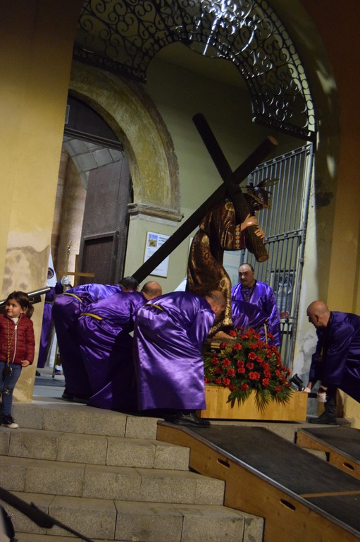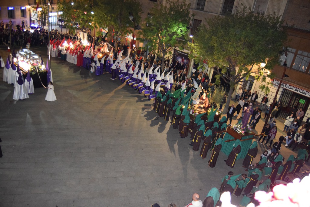 A continuación se procesionaron los pasos del Ecce Homo y de la Virgen de los Dolores por la ciudad, produciéndose el encuentro en la plaza Mayor.